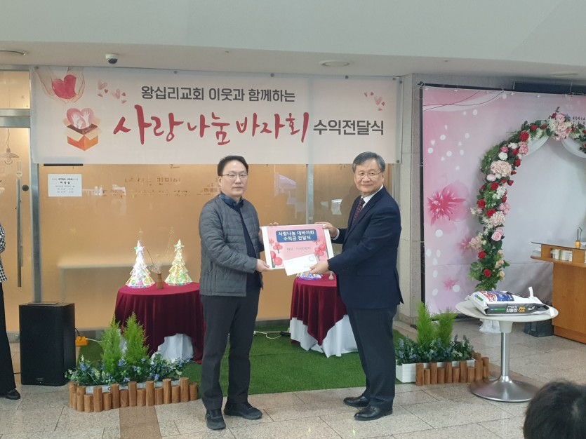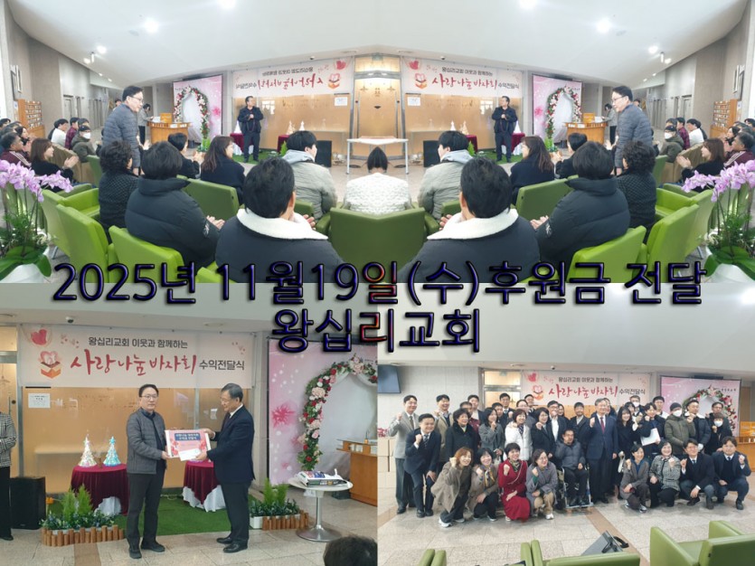 2025.11.19(수) 왕십리교회 후원금 전달 페이지 정보 조회 : 50회 작성일 : 25-11-19 15:06 본문 왕십리교회에서 저희 가나안쉼터에 올해도 후원금을 지원하여 주셨습니다. 감사합니다. 목록 다음글2025.11.17(월)생활인 생일자 축하 25.11.19